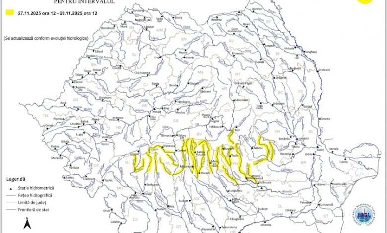 Institutul Național de Hidrologie și Gospodărire a Apelor (INHGA) a emis o atenționare hidrologică Cod galben valabilă de joi, 27 noiembrie, ora 12:00, până vineri, 28 noiembrie, ora 12:00.