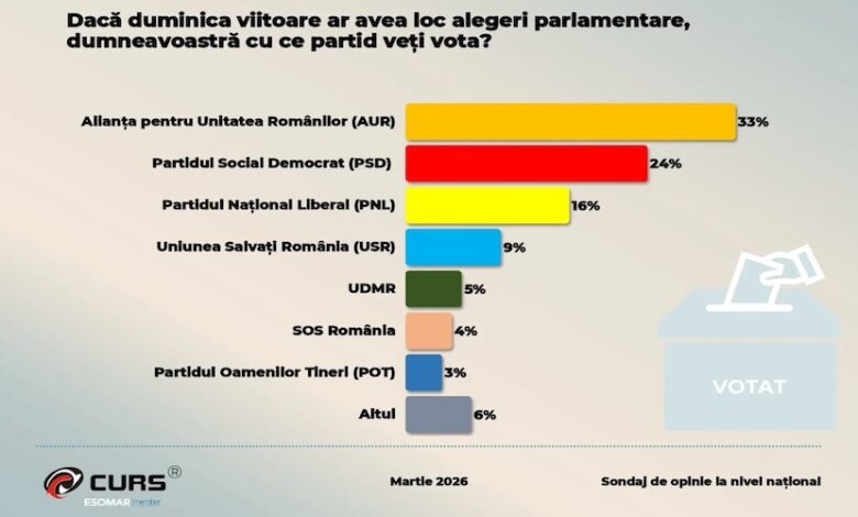 Datele celui mai recent sondaj CURS, realizat la finalul lunii martie 2026, conturează o scenă politică în care diferențele dintre principalele partide încep să se diminueze, iar nemulțumirea publică devine un factor tot mai influent în orientarea votului.